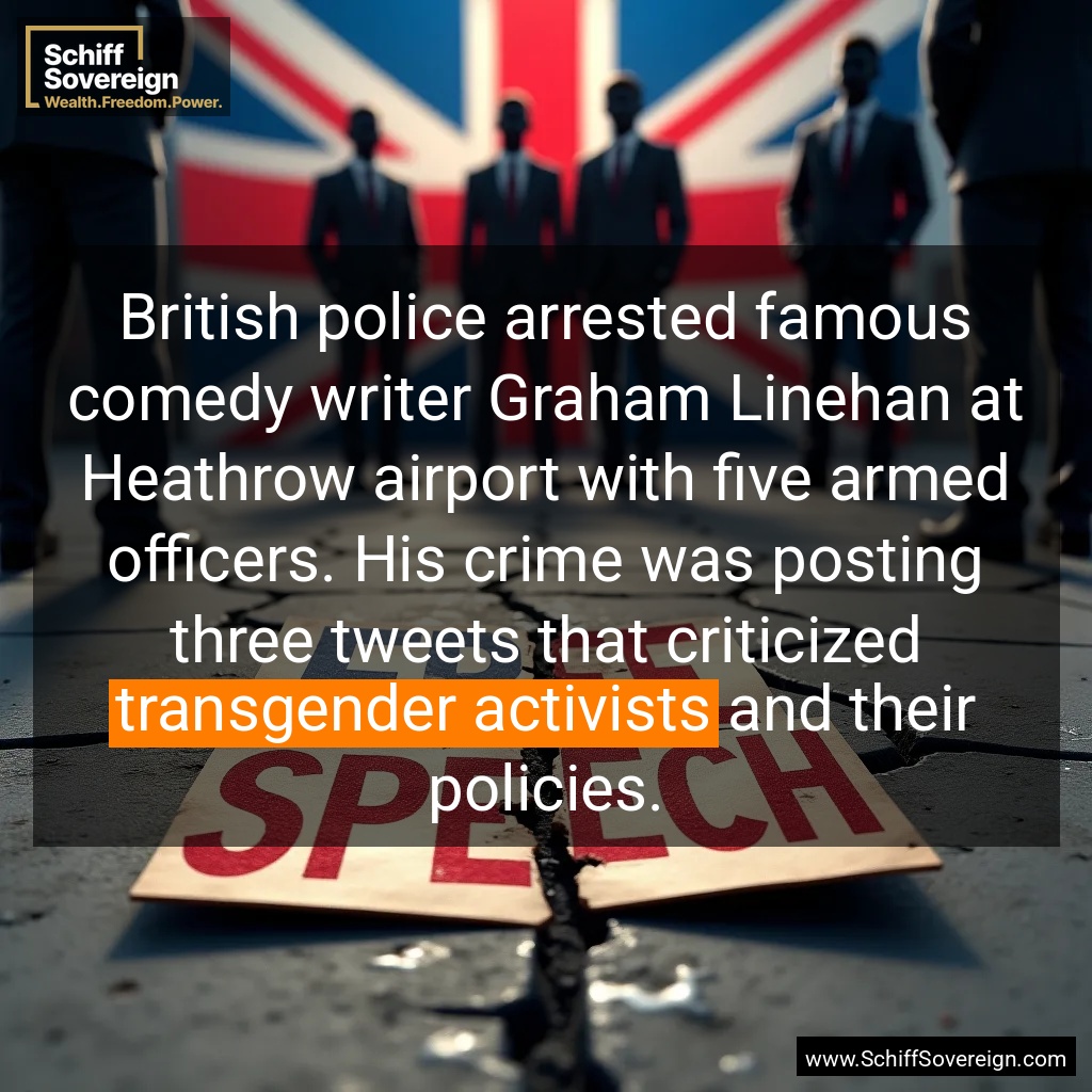 British police arrested famous comedy writer Graham Linehan at Heathrow airport with five armed officers. His crime was posting three tweets that criticized *transgender activists* and their policies.