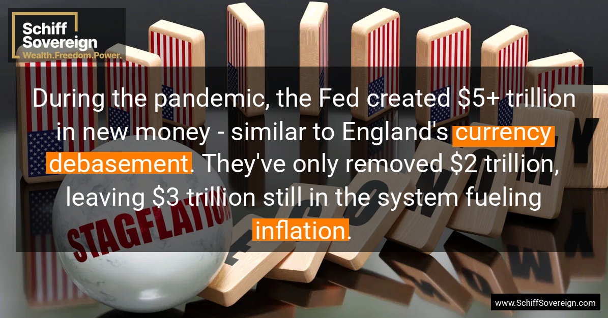 During the pandemic, the Fed created $5+ trillion in new money - similar to England's *currency debasement*. They've only removed $2 trillion, leaving $3 trillion still in the system fueling *inflation*.