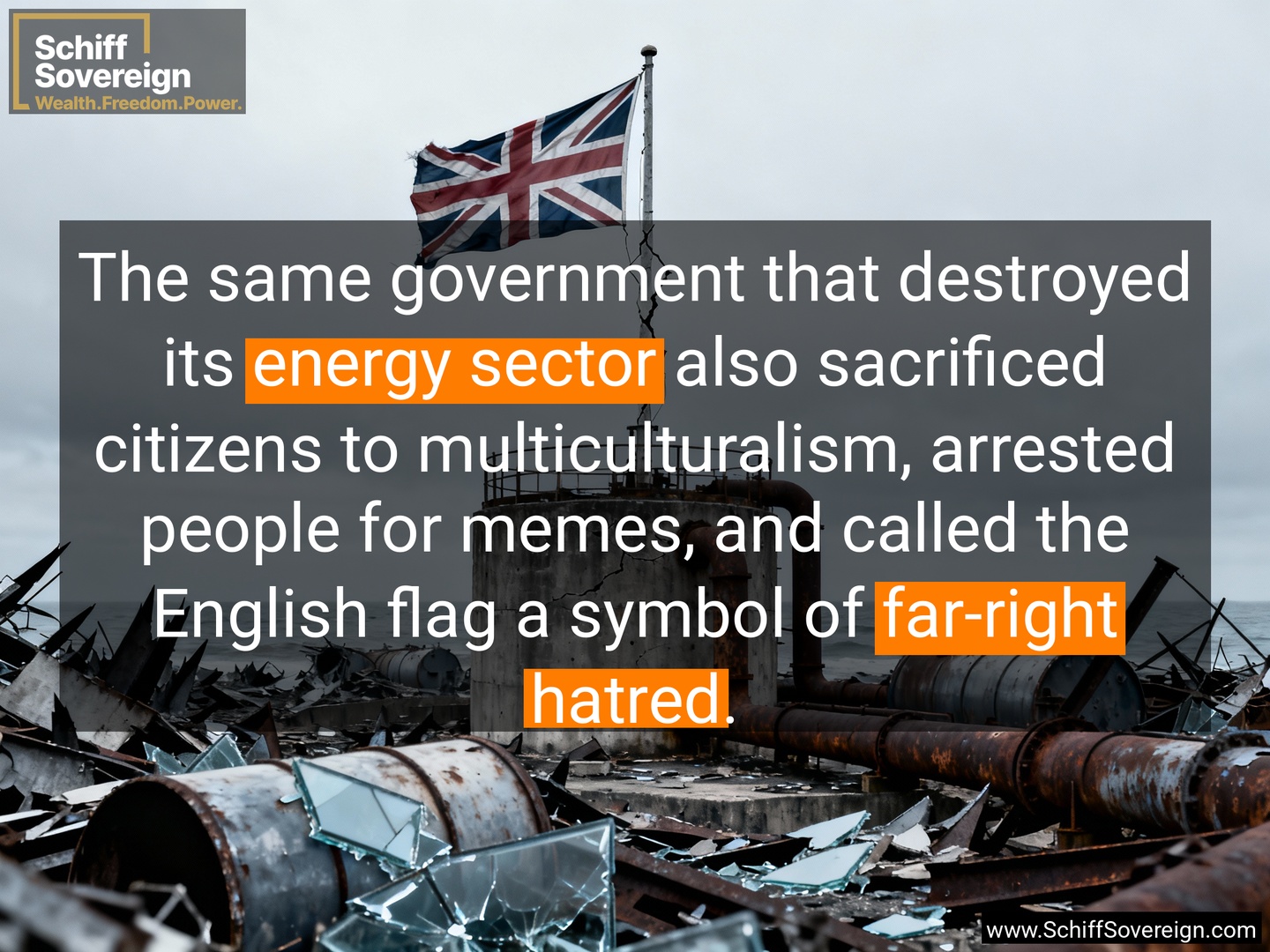 The same government that destroyed its *energy sector* also sacrificed citizens to multiculturalism, arrested people for memes, and called the English flag a symbol of *far-right hatred*.