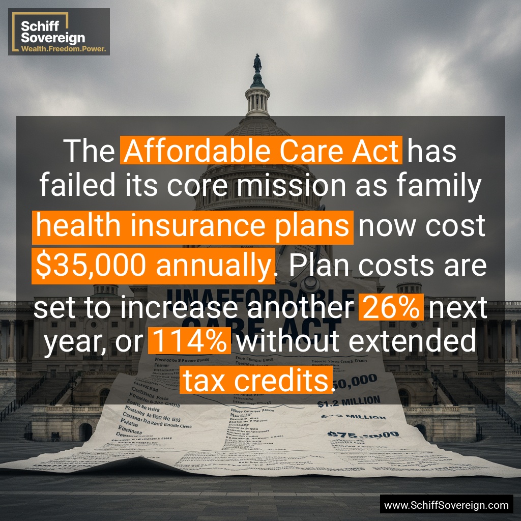 The *Affordable Care Act* has failed its core mission as family *health insurance plans* now cost *$35,000 annually*. Plan costs are set to increase another *26%* next year, or *114%* without extended *tax credits*.
