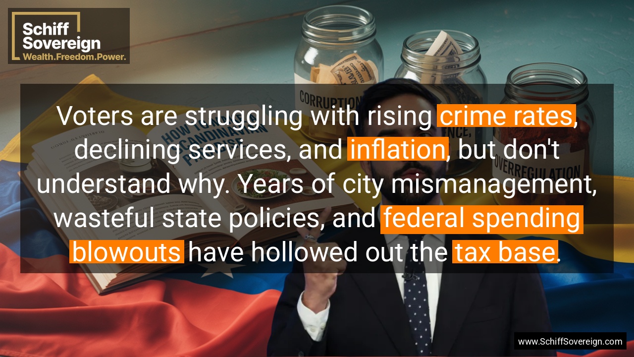 Voters are struggling with rising *crime rates*, declining services, and *inflation*, but don't understand why. Years of city mismanagement, wasteful state policies, and *federal spending blowouts* have hollowed out the *tax base*.