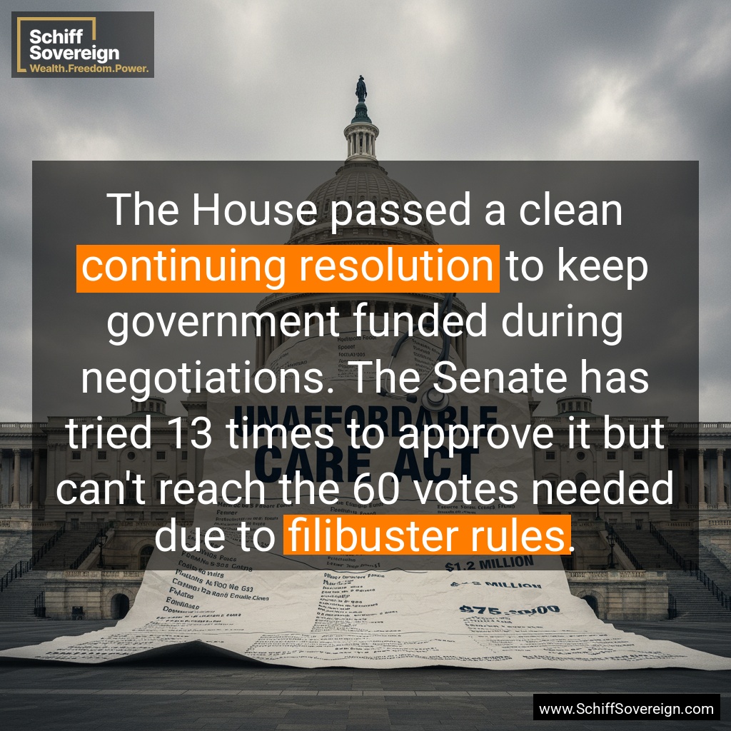 The House passed a clean *continuing resolution* to keep government funded during negotiations. The Senate has tried 13 times to approve it but can't reach the 60 votes needed due to *filibuster rules*.