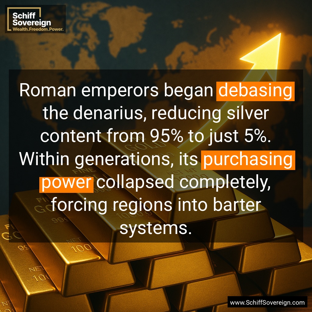 Roman emperors began *debasing* the denarius, reducing silver content from 95% to just 5%. Within generations, its *purchasing power* collapsed completely, forcing regions into barter systems.