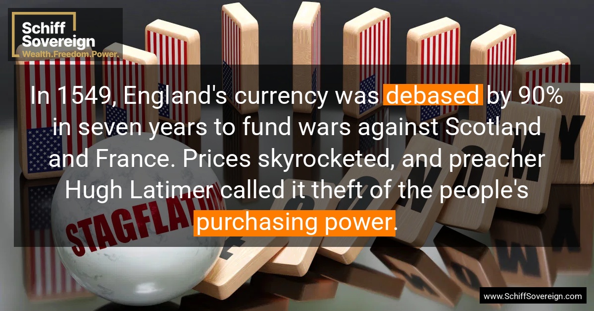 In 1549, England's currency was *debased* by 90% in seven years to fund wars against Scotland and France. Prices skyrocketed, and preacher Hugh Latimer called it theft of the people's *purchasing power*.