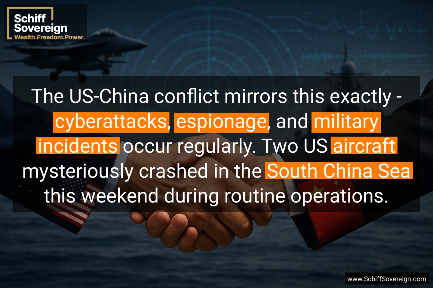 The US-China conflict mirrors this exactly - *cyberattacks*, *espionage*, and *military incidents* occur regularly. Two US *aircraft* mysteriously crashed in the *South China Sea* this weekend during routine operations.
