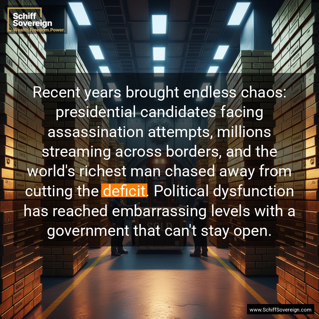 Recent years brought endless chaos: presidential candidates facing assassination attempts, millions streaming across borders, and the world's richest man chased away from cutting the *deficit*. Political dysfunction has reached embarrassing levels with a government that can't stay open.