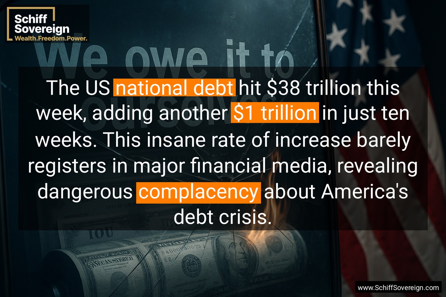 The US *national debt* hit $38 trillion this week, adding another *$1 trillion* in just ten weeks. This insane rate of increase barely registers in major financial media, revealing dangerous *complacency* about America's debt crisis.