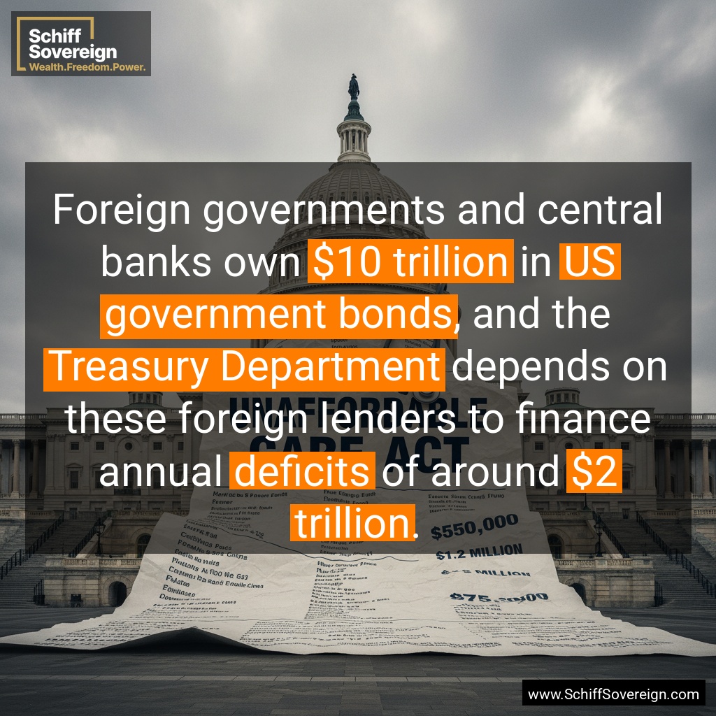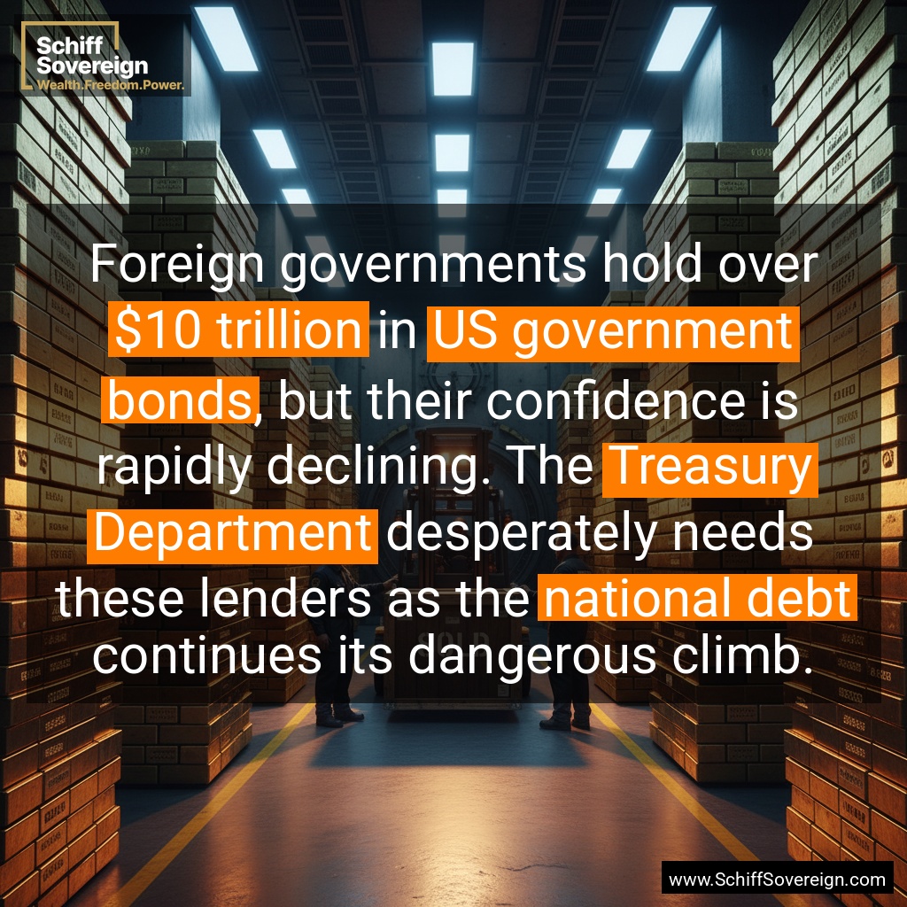 Foreign governments hold over *$10 trillion* in *US government bonds*, but their confidence is rapidly declining. The *Treasury Department* desperately needs these lenders as the *national debt* continues its dangerous climb.