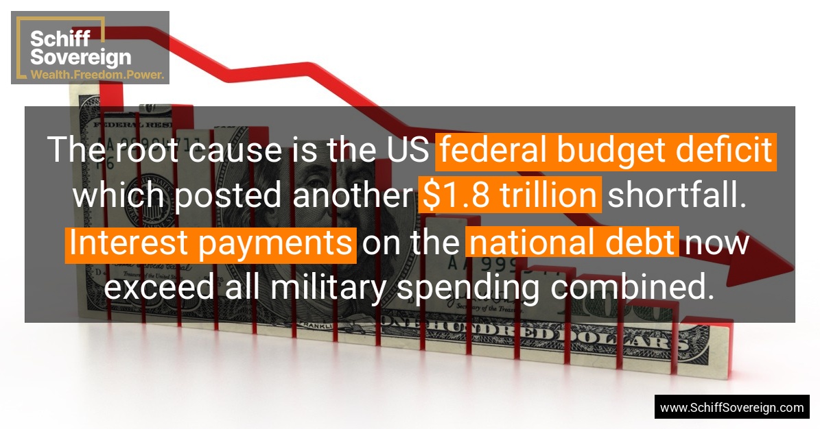 The root cause is the US *federal budget deficit* which posted another *$1.8 trillion* shortfall. *Interest payments* on the *national debt* now exceed all military spending combined.