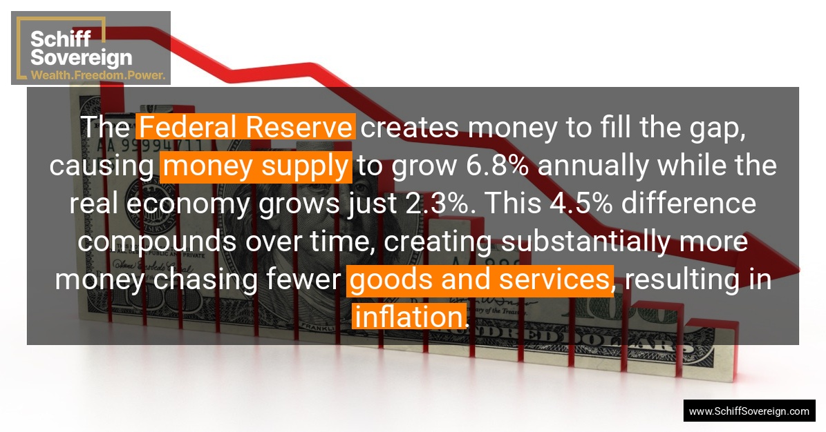 The *Federal Reserve* creates money to fill the gap, causing *money supply* to grow 6.8% annually while the real economy grows just 2.3%. This 4.5% difference compounds over time, creating substantially more money chasing fewer *goods and services*, resulting in *inflation*.