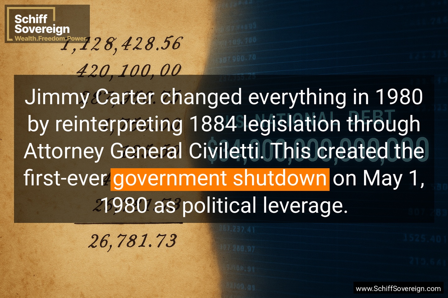 Jimmy Carter changed everything in 1980 by reinterpreting 1884 legislation through Attorney General Civiletti. This created the first-ever *government shutdown* on May 1, 1980 as political leverage.