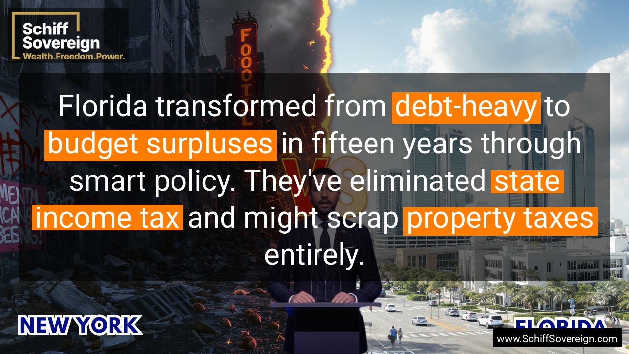 Florida transformed from *debt-heavy* to *budget surpluses* in fifteen years through smart policy. They've eliminated *state income tax* and might scrap *property taxes* entirely.