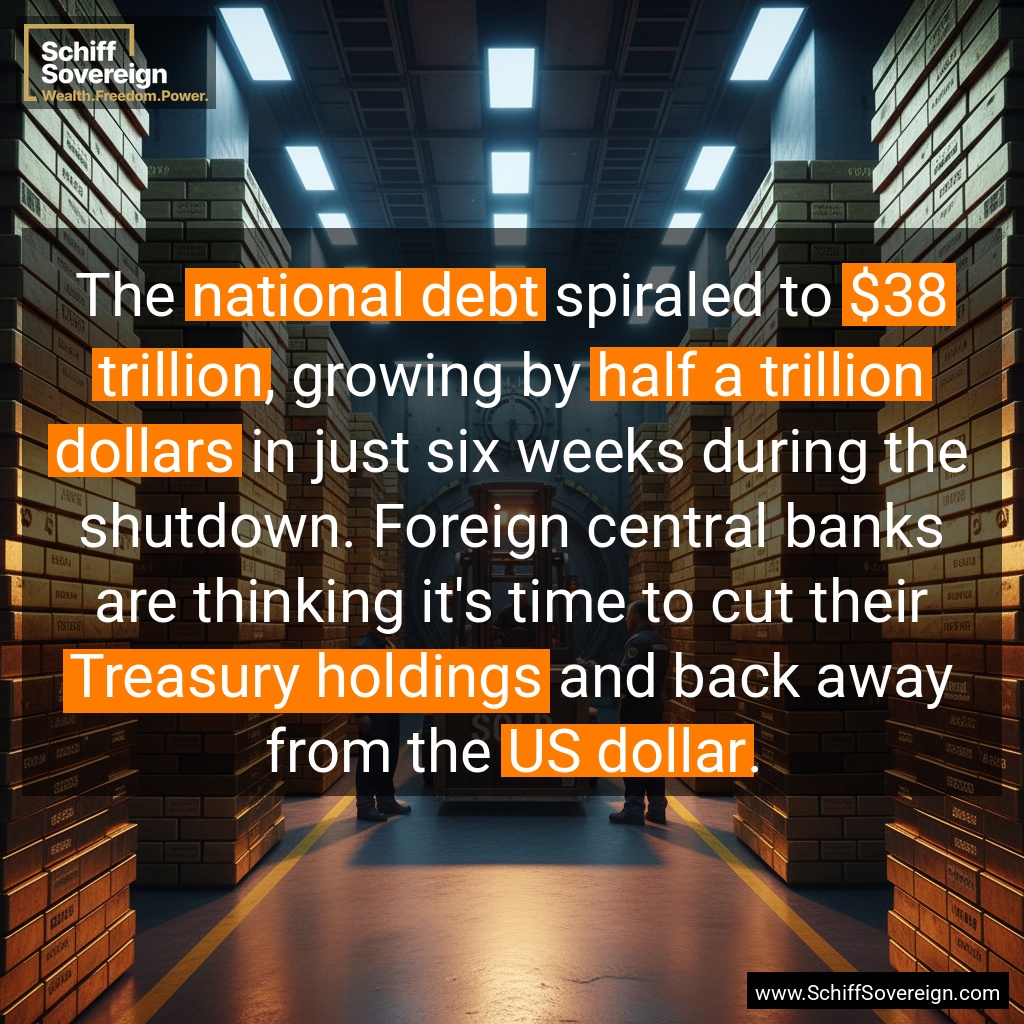 The *national debt* spiraled to *$38 trillion*, growing by *half a trillion dollars* in just six weeks during the shutdown. Foreign central banks are thinking it's time to cut their *Treasury holdings* and back away from the *US dollar*.