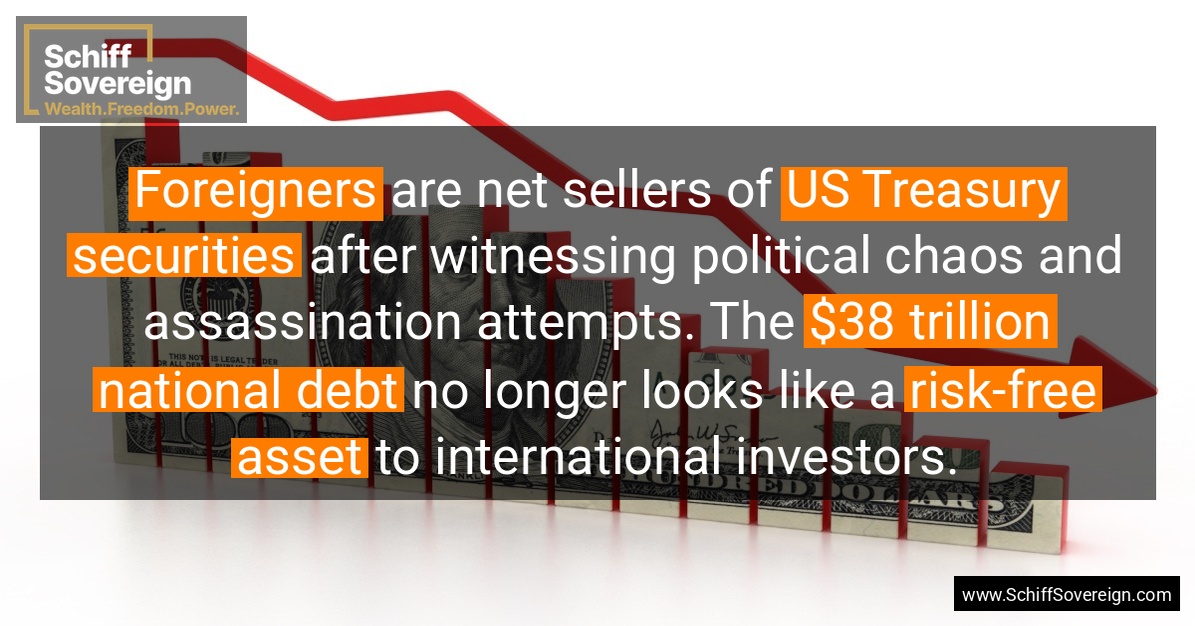 *Foreigners* are net sellers of *US Treasury securities* after witnessing political chaos and assassination attempts. The *$38 trillion national debt* no longer looks like a *risk-free asset* to international investors.